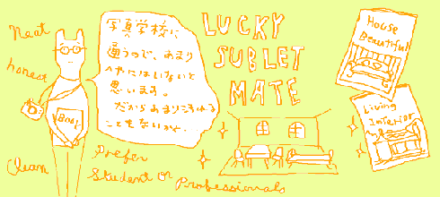 私の場合、基本的にサブレットの相手は日本人オンリーにしている。いくら綺麗好きといっても、土足文化の人間とでは、部屋に関する感覚は違うはずだからだ。本来なら、友達の知り合いあたりが借りてくれたら安心なのだが、時期的にマッチする人はそうもいない。そこで日本系のスーパーマーケットや書店の掲示板に張り紙をする。前に一度自宅の電話番号を書いたら、朝からがんがん電話がかかってきてたまらなかったので、それ以来留守電専用のヴォイスメイルを記しておく。そしてこちらから連絡し、興味のある人にはまず部屋を見てもらうのだ。今までの経験で言うと、女より男の人のほうが部屋を綺麗に使ってくれることが多かったのが不思議なところ。私が住んでいたときよりも、掃除が行き届いていたりして、びっくり。ずぼらな私はおもわず、物腰のきちんとしたそのサブレット相手に訊いてみた。
