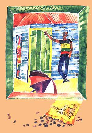 掲載誌/ 小説すばる 2000/10月号 短編「コーヒー園のにおい」挿画 (集英社/野中ともそ 著) Watercolor on paper ジャマイカのコーヒー園を舞台にした短編ということで、「カリブ海おひるねスケッチ」ジャマイカ編より抜粋したイラストに、コーヒービーンズをコラージュしてみました。 |